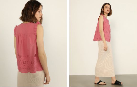 Volvemos a las blusas pensadas para las mujeres más jóvenes. La marca de El Corte Inglés Fórmula Joven nos plantea una blusa sin mangas, aderezada con los volantes que hemos mencionado en el modelo anterior de la casa, y le da un punto diferencial con dos elementos: aunque apuesta por tonos monocolor, el plisado de la pechera y el toque del calado en la parte baja del cuerpo dan un aire nuevo a una pieza clásica. De cuello cerrado redondo, y espalda completamente cubierta, puede ser tuya en este rosa palo o en blanco. ¿Con cuál te quedas? ¡Sólo cuestan 29,99 euros!