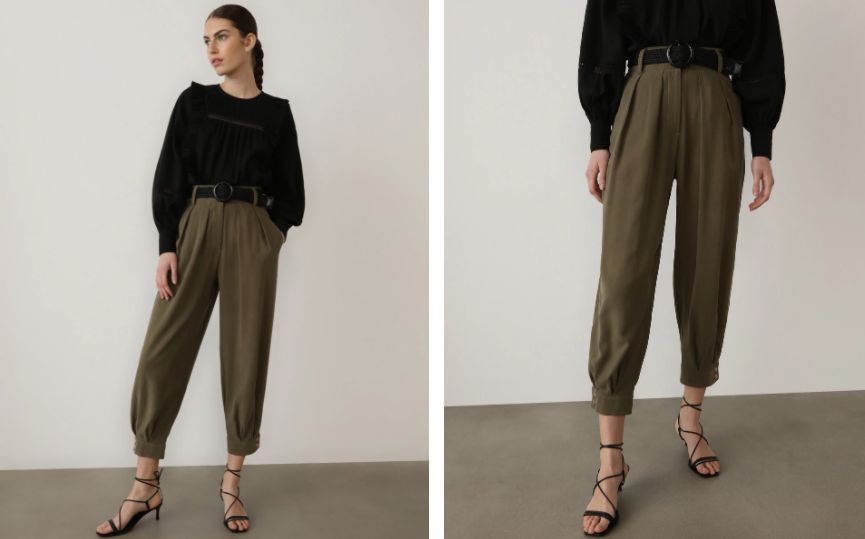 Toca ahora un pantalón del propio Corte Inglés y su Fórmula Joven. Lo escogemos para mostrarte como ves pantalones muy diferentes en estilo unos de otros y así ver el que más se adapta, o quizá tomar buena nota si quieres comprar varios y precisamente muy diferentes entre sí para combinar. En este caso te mostramos este pantalón slouchy con botones y cinturón. Un modelo elegante, más pensado para grandes ocasiones, pero no te asustes, porque el precio no va acorte. Te cuesta sólo 35,99 euros. Está disponible en color kaki. Está hecho mayormente en viscosa (90%) y resto en poliéster.