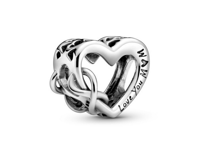 Este otro artículo de Pandora también está a un precio realmente increíble. Es el charm Love You Mum Corazón Infinito, creado en plata de primera ley y adornado con grabados.