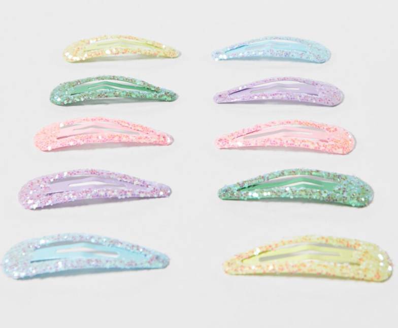 La moda de Bershka siempre destaca por ser especialmente colorida, y cuando se trata de complementos para el cabello no se quedan atrás. Por eso, no nos hemos podido resistir a este set de 10 pasadores en colores pastel y adornados con brillantina. La opción perfecta para pasar de un look más aburrido a uno divertido y llamativo.