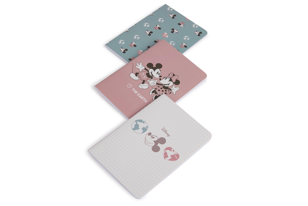 Es un pack de 3 cuadernos con portadas adornadas con los míticos dibujos, como los de Mickey Mouse y Minnie. Todos ellos con un tamaño de hoja A6, es decir, de 10,5×14,8 cm (ancho y alto).