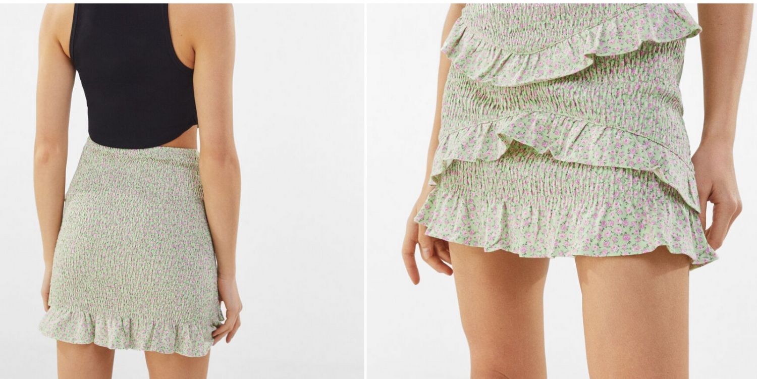 Otra de las grandes elecciones para renovar tu fondo de armario y conseguir faldas para esta temporada es esta falda mini print volantes de Bershka. Está disponible en varias tallas por solo 15.99€.
