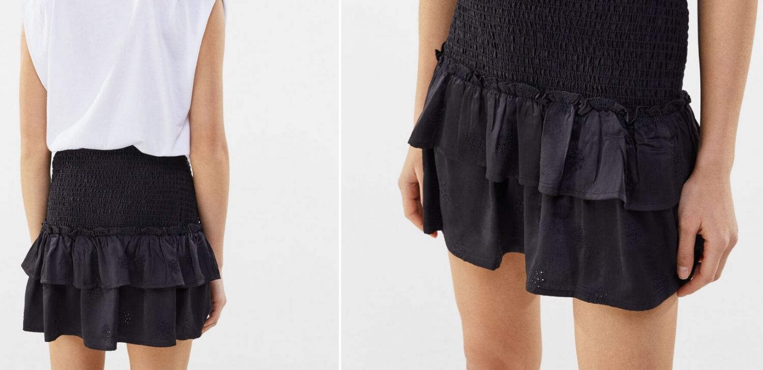 Otra de las faldas más populares y vendidas de Bershka es esta falda satinada bordado suizo que encontrarás en estas tiendas por solo 19,99€.