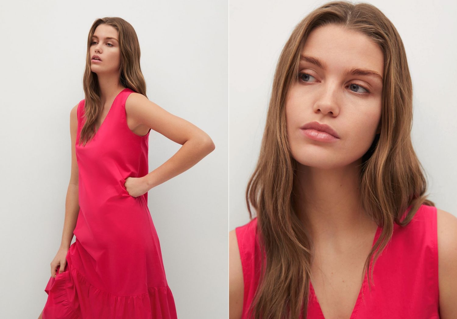 Un ejemplo es este vestido de Mango de color fucsia. Tan solo cuesta 25.99€ y está confeccionado en tejido 100% algodón. Con un diseño ligero, fluido, acampanado, con cuello de pico, sin mangas, volante bajo, y cierre de cremallera posterior.