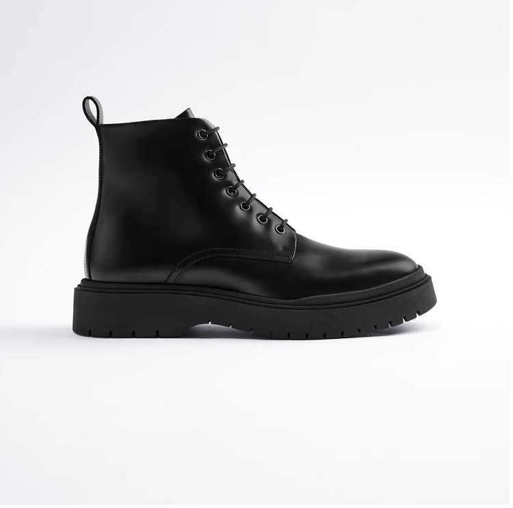 Seguimos con esta bota de piel con cordones de color negro de Zara. Tiene cordonera con siete pasados y tirados en la parte de atrás de la bota, algo que hace que te puedas calzar mejor. El corte es 100% piel vacuno, su suela 100% caucho termoplástico, su plantilla 100% piel vacuno y su lengüeta 100% piel vacuno.