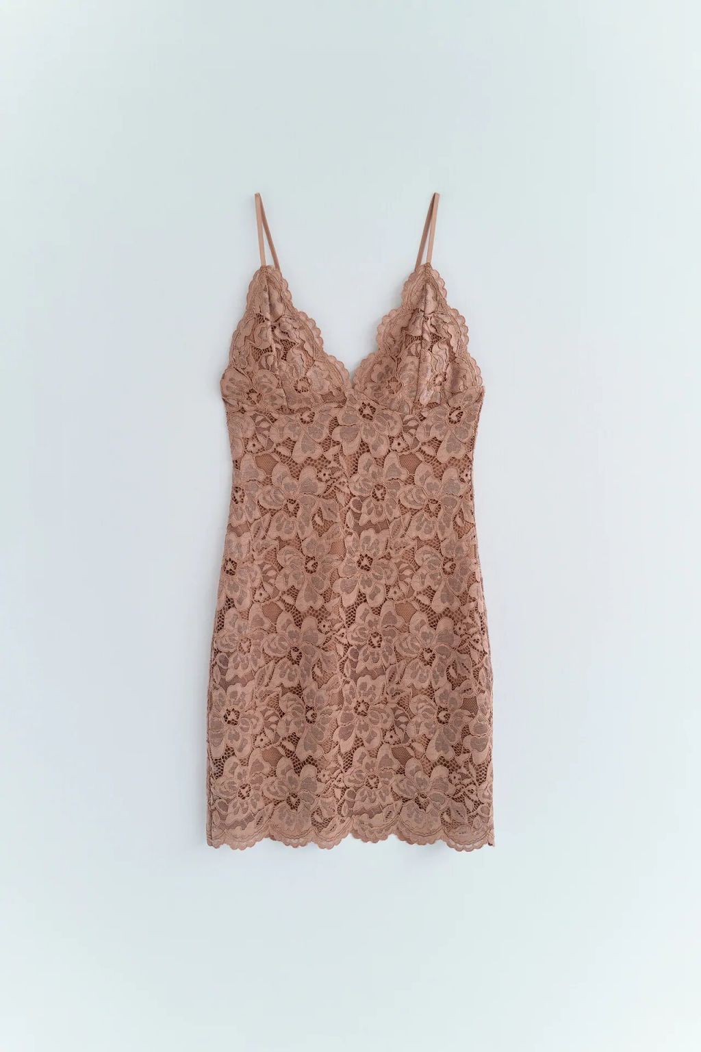 Dejamos el color negro a un lado, aunque a este le sienta de maravilla el encaje, también hay colores claros con los que se ve ideal. Un claro ejemplo es este diseño corto de Zara en color rosa claro. Un modelo ajustad al cuerpo para que presumas de figura y escote de pico con tirantes finos ajustables.