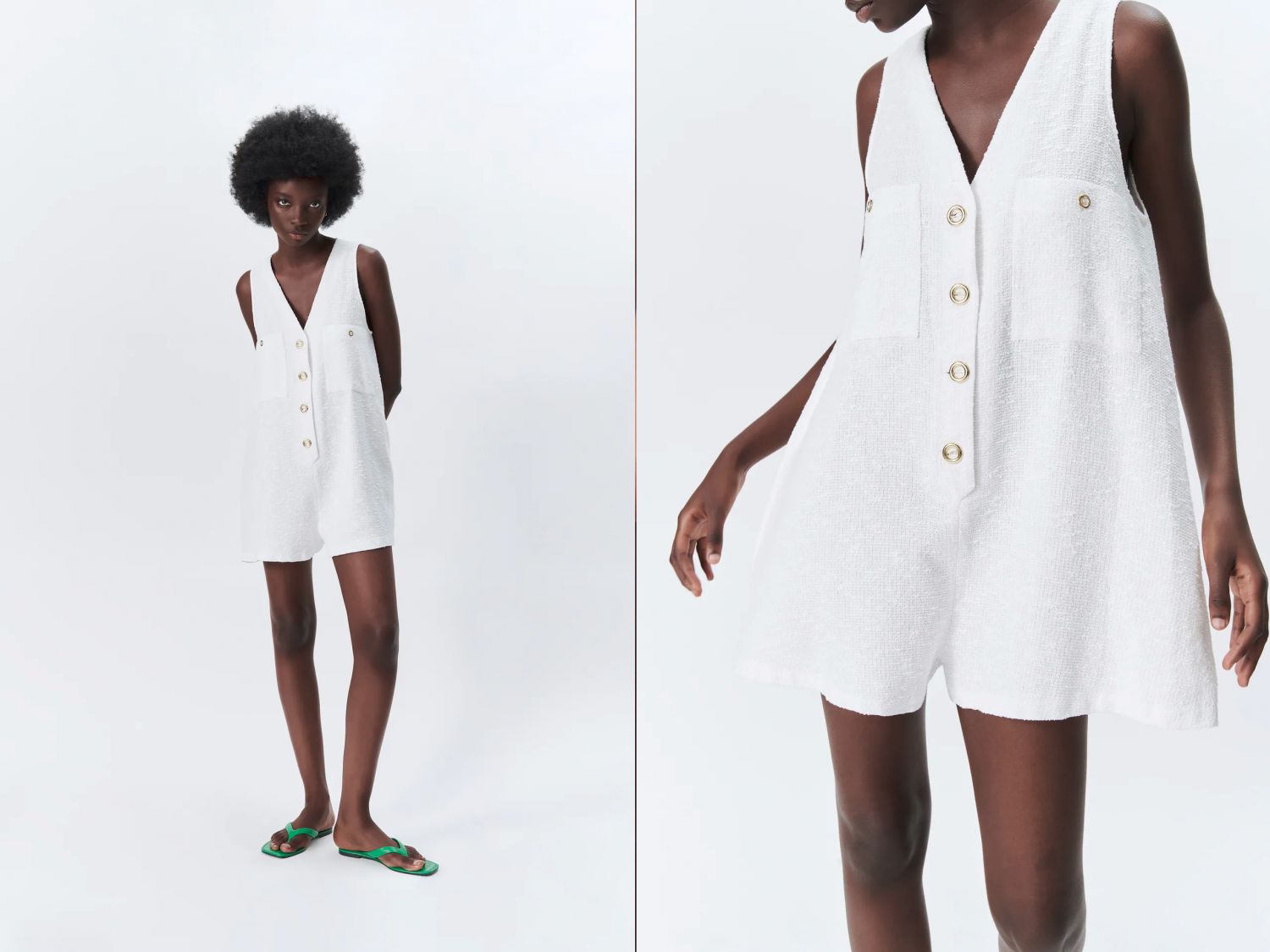 Otro de los monos de moda de Zara que debes agregar a tu próximo pedido es este mono corto estructura. Está disponible en varias tallas, en color blanco roto, y por solo 29.95€.