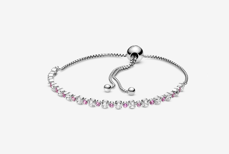 Para las que se atrevan con un complemento algo más sofisticado, Pandora tiene esta pulsera que combina el rosa y el transparente en sus brillantes. Disponible en varias tallas y por 59€.