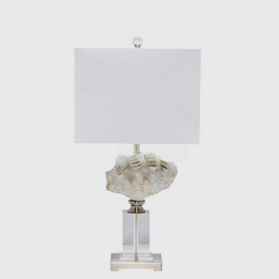 Este tipo de producto para nuestro hogar, se caracteriza por ser una lámpara de mesa con base de cerámica esmaltada y pantalla textil. Además, el cuerpo es muy decorativo, con peanas en dorados y motivos que nos permite recordar a una concha marina, en colores azules de inspiración costera. Siendo una lámpara completamente grande, estable y delicada, se debe a que la cerámica es un material fácilmente dañable en casos de golpe.