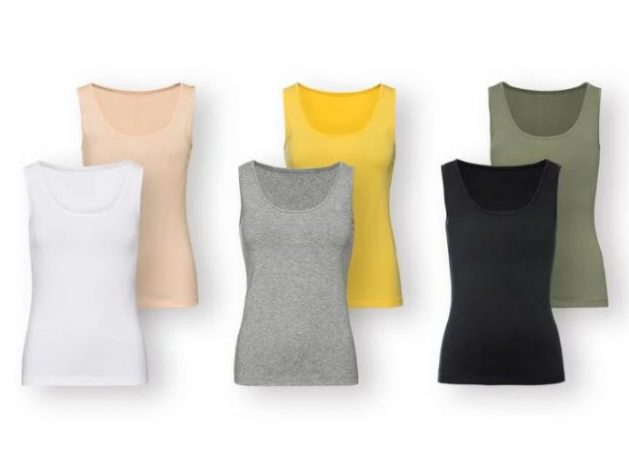 En mujer es sin duda la prenda que destaca como la más vendida de entre toda la colección de ropa barata de Lidl. Se trata de esta camiseta básica de algodón y elastano que vende en pack de dos unidades. Se diferencian de las primeras en que estas tienen escote en caja y tirantes anchos, con espalda alta cerrada. Y que se venden de dos en dos. Los tonos también son diferentes, más contrastados, por lo que dan más juego a la hora de utilizarlos. Su precio es incluso más barato: 4 euros las dos piezas.