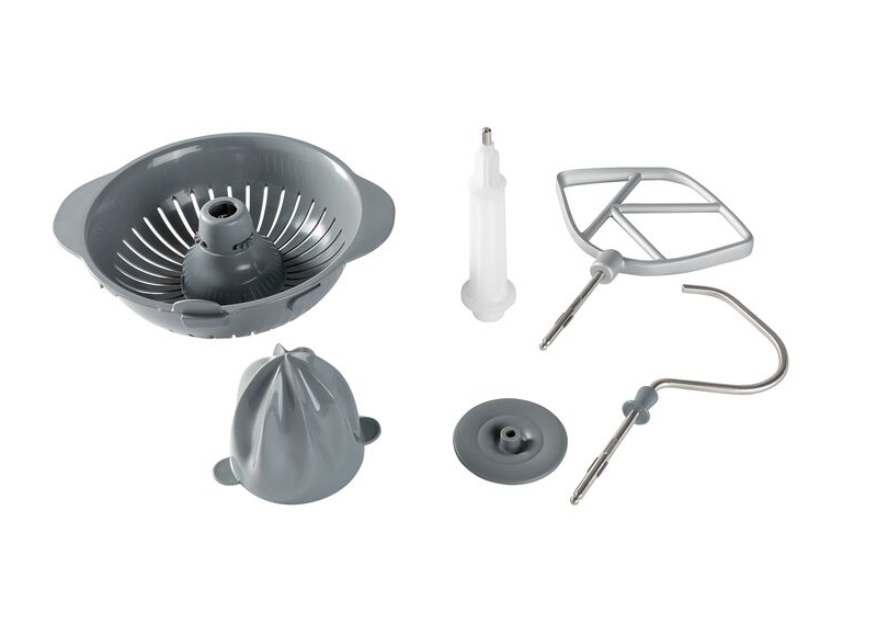 Llama mucho la atención, además de los otros accesorios, que incluya entre las herramientas una batidora de vaso de cristal, el procesador de alimentos de tres discos de acero inoxidable y el exprimidor… Eso lo transforman en una completa estación de cocina.