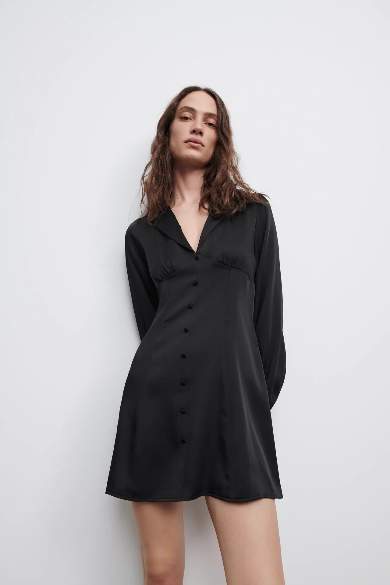 Este vestido de Zara es un modelo con escote de pico y solapa, tiene manga larga, la cual acaba en elástico. Tiene también detalle de falsos botones y acabado en evasé. Su precio es de 29,95 euros, y podrás encontrarlo entrando en este enlace.