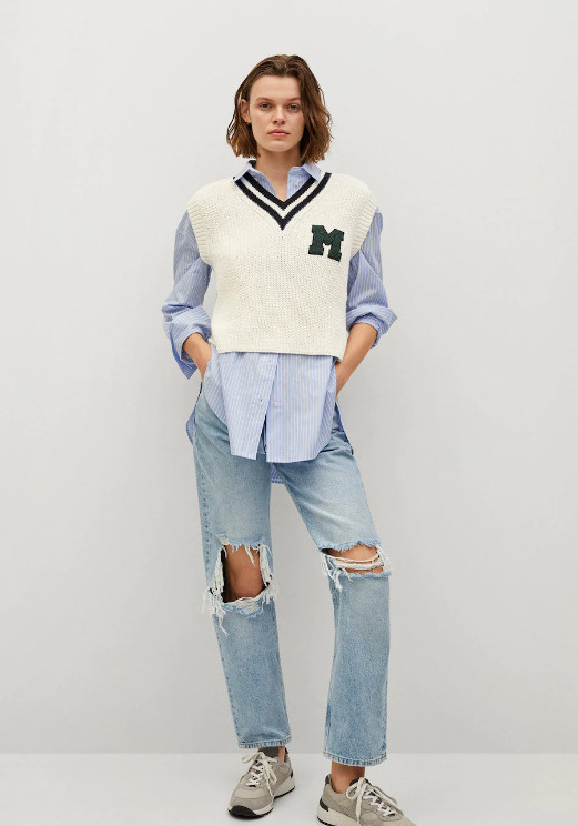 Muchas de las mujeres que se acercan hasta cualquiera de las tiendas que mango tiene repartidas a lo largo del país sin intención de comprar nada, solo para echar un vistazo, acaban por enamorarse de esta prenda. Y a nosotros no nos extraña. Se trata de un chaleco fabricado 100% a base de algodón reciclado que tiene una letra en textura en la parte delantera que le da mucha fuerza y personalidad. Además, también tiene un detalle de rayas en contraste. Y además sale muy bien de precio. Tan solo cuesta 25 euros.