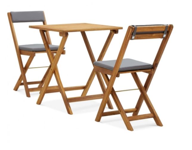 El juego de muebles de terraza está fabricado en acacia y tratado con aceite para resistir en el exterior. Incluye los cojines del respaldo y el asiento, con fundas extraíbles para su limpieza y lavado. La mesa mide 60 x 60 x 73 cm (largo x ancho x alto).