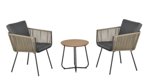 ¿Quieres un conjunto con un toque más moderno y elegante? Tranquilo. En el catálogo de muebles de jardín y terraza de Carrefour hay para todos los gustos. Como este conjunto de 1 mesa de centro y dos sillas de acero y ratán sintético en un neutro color caqui que combina con todos los estilos. La mesa aporta un toque único con esa mezcla de acero en las patas y madera en la tabla. Las sillas incluyen los respectivos cojines para asiento y respaldo, en tonos grises que combinan a las mil maravillas con el conjunto. El salón de exterior ideal para que tomes un descanso solo o te relajes con tus amigos bajo el sol. Puede ser tuyo por tan sólo 191,49 euros.