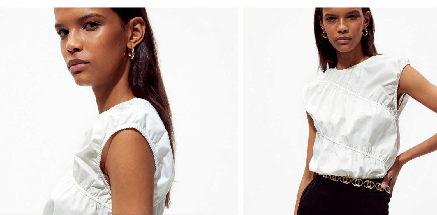 Este otro top bimateria con gomas también lo encontrarás en varias tallas en Sfera y con un precio muy jugoso, ya que cuesta 23.99€. Se puede combinar con múltiples faldas o pantalones, para completar tu look, o puede ser una alternativa al anterior top.