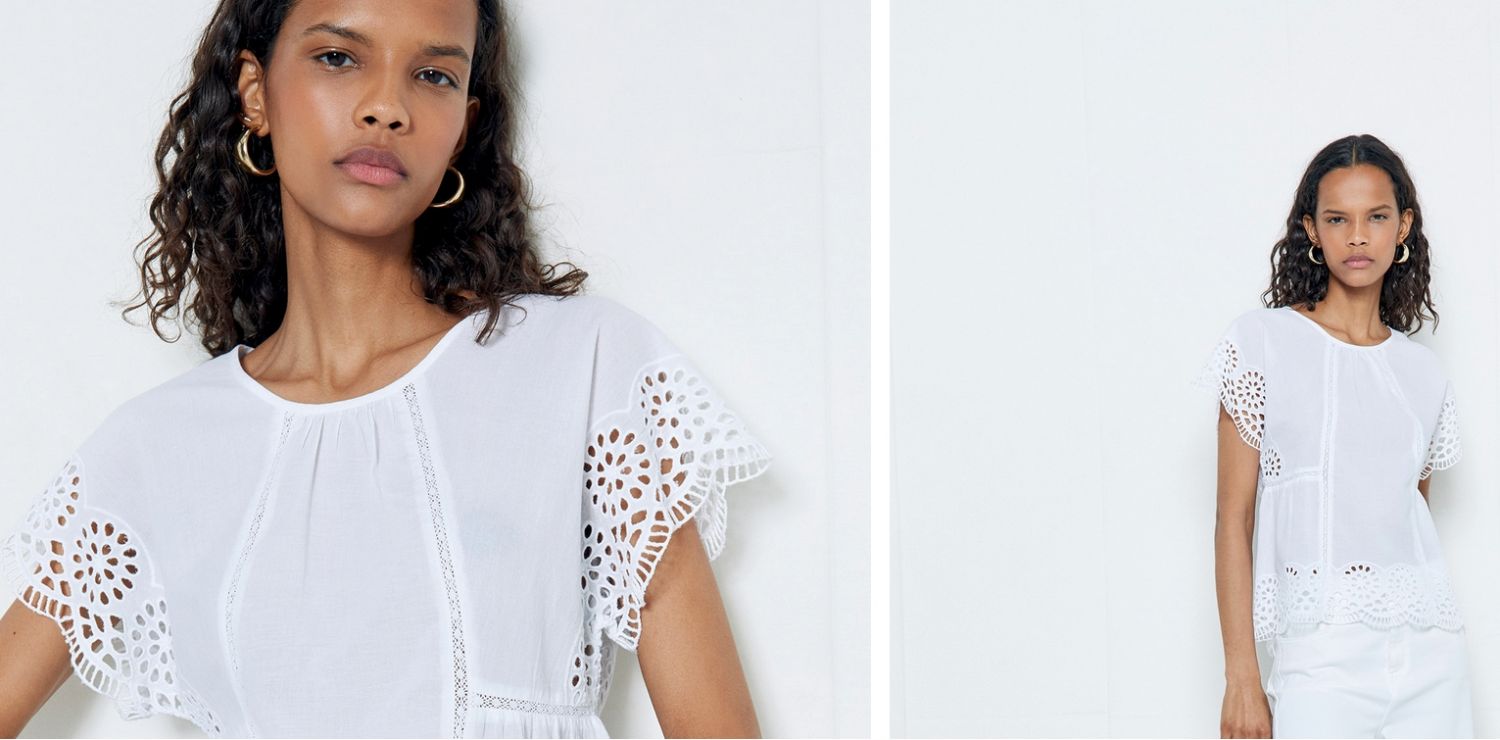 Tiene una manga calada, y unos detalles también calados en la cintura y a lo largo de la prenda. Además, está fabricada en fibras 100% algodón, por lo que serán perfectas esta época en la que se transpira más…
