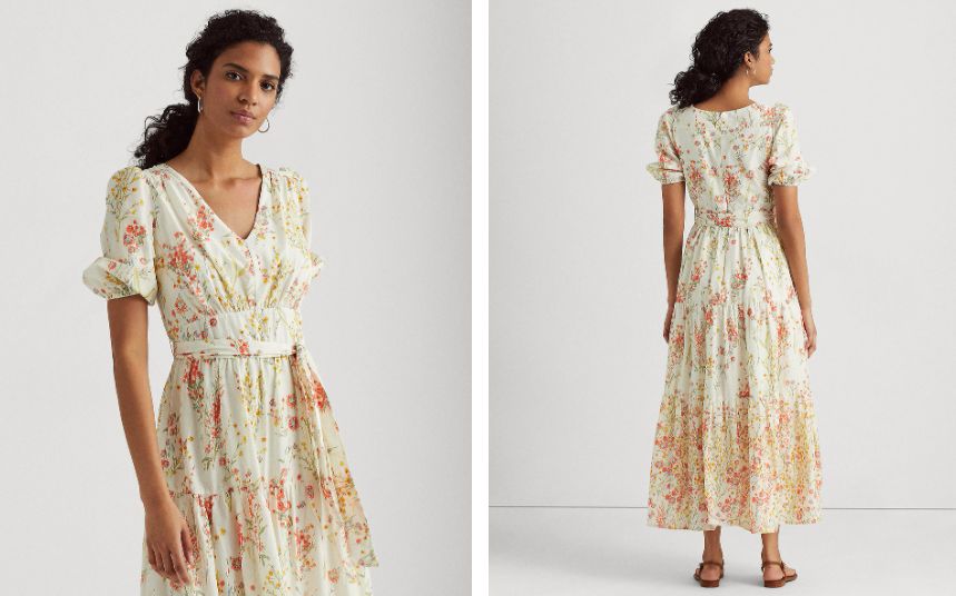 Volvemos a los modelos de Ralph Lauren para destacar este precioso, elegante y deseable vestido largo de manga corta fluido con lazo en la cintura. Las mangas, cortas, aquí sí son abullonadas. El escote en pico y la tela del corpiño fruncida consiguen que siente muy bien tanto a quienes tienen más busto como a quienes tienen menos talla. En la espalda es completamente cerrado, lo que ayuda a que siente incluso mejor. Está confeccionado en 100% algodón con un estampado muy sutil y alegre. Consíguelo en El Corte Inglés.
