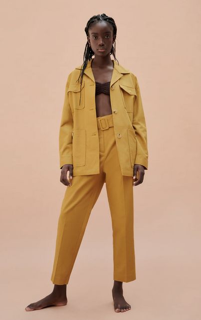 Otro total look espectacular que nos propone Zara es este tan original que se compone de un pantalón clásico con diseño paperbag, de tiro algo y pierna recta. Lleva dos bolsillos laterales, cierra con botón, gancho metálico y cremallera y se complementa con un cinturón forrado con el mismo tejido.