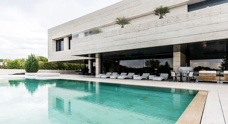 Con una piscina infinita, un diseño vanguardista y las cristaleras como elementos característicos, otra de las casas que se vende en esta urbanización mantiene su precio en los 7.950.000 euros, unos 6.320 €/m2.