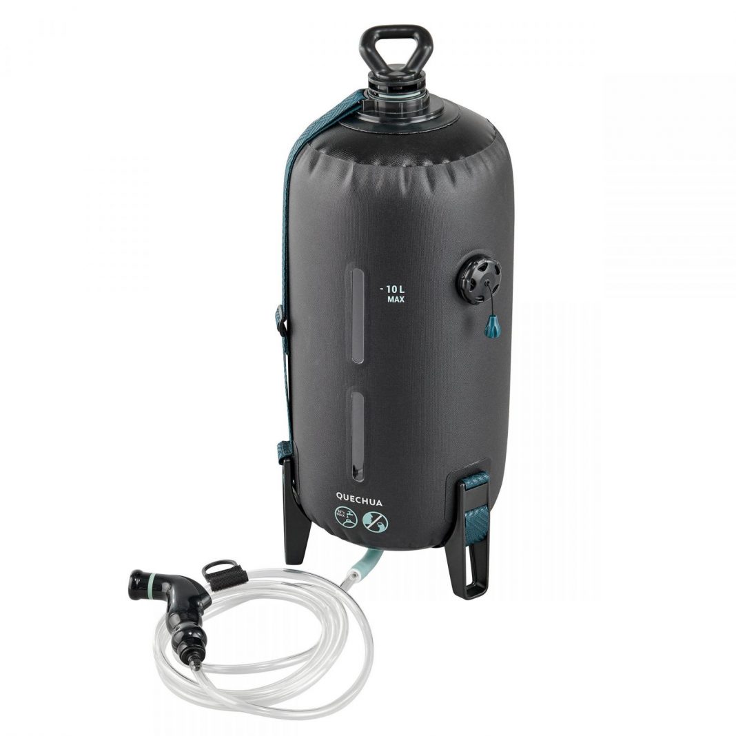 El equipo de campista de Decathlon ha concebido esta ducha a presión de 10 litros, para que las personas se duchen cómodamente en el exterior y para lavar ropa. El objetivo principal de la empresa, es ofrecer una solución para no tener que colgar la ducha solar, por lo que tendrán agua con presión. Esto se debe gracias al sistema de bombeo, incluso con el depósito en el suelo.
