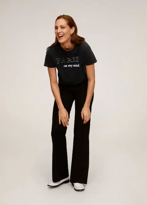 La camiseta está compuesta por un tejido de algodón muy cómodo de llevar. El estampado lleva la frase ‘Paris on my mind‘ en el centro de la camiseta, de color negro. Esta prenda es de manga corta y tiene un cuello en forma redonda. Es una de las camisetas más rebajadas de la tienda Mango, y la puedes adquirir a un precio de 5,99 euros.