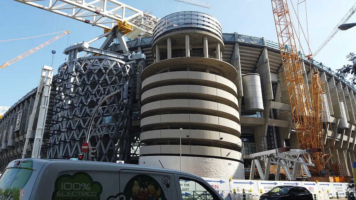 La reforma del Santiago Bernabéu está centrada ahora en diferentes trabajos para acondicionar el terreno de juego, en la construcción del parking, en el túnel logístico y en la cubierta, donde el techo retráctil va tomando forma tras la colocación de diferentes cerchas.