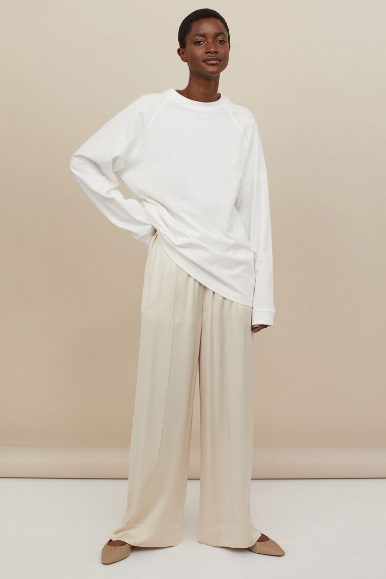 Es una camiseta de punto de corte relajado, se caracteriza por ser un modelo único con mangas largas y cuello. Además, y bajo en punto elástico de canales; fabricada en 100% de algodón. La modelo de la foto mide 1,77 y lleva una talla s, siendo una referencia para que puedas obtener el tuyo por la plataforma de H&M por solo 24,99 euros.