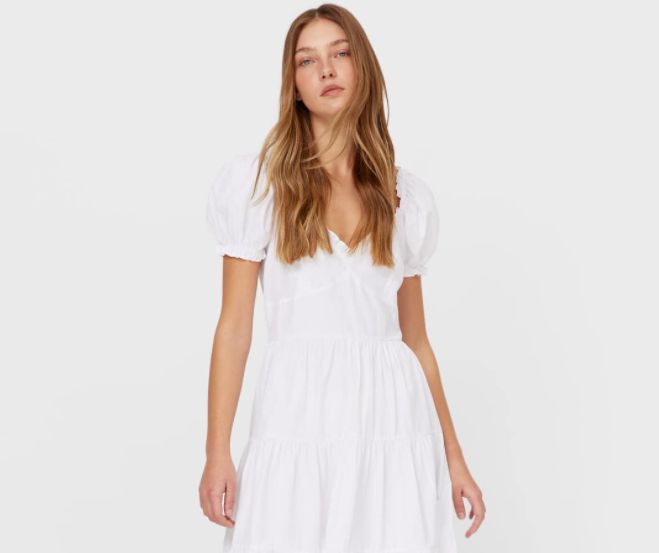 Pasamos a otro clásico del verano, como es un vestido en estilo ibicenco. Se trata de este midi popelin en color blanco. Lleva escote de corazón, manga corta abullonada y detalle de bajo acabado en volante. Otro vestido de Stradivarius que se vende sin parar y que está disponible en tallas S, M y L. Su precio es de 25,99 euros. Este tipo de prendas siempre son tendencia y ninguna temporada pasan de moda. No hay vestido más cómodo y que luzca más en vacaciones sobre todo, pero en cualquier evento o momento veraniego. Luego de ti depende si cerrar el conjunto de manera perfecta con un sombrero y unas bonitas sandalias.