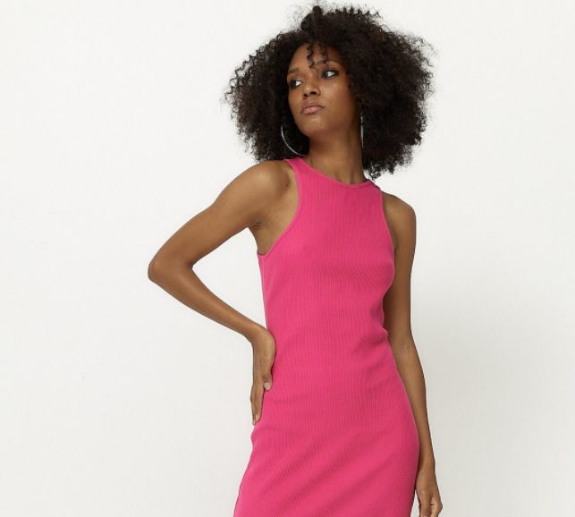 Pasamos a un concepto diferente y más transgresor pero igualmente cómodo para este tiempo. El fucsia también es tendencia y por supuesto pertenece a la nueva colección en Stradivarius. Hablamos de este vestido midi de cuello halter sin magnas con abertura en bajo y disponible en varios colores: gris, azul celeste, naranja, azul, negro y verde. Por el precio de 17,99 euros te da para comprar más de uno, en varios colores y así combinar. Un vestido que estiliza la figura y que está disponible de tallas XS a L.