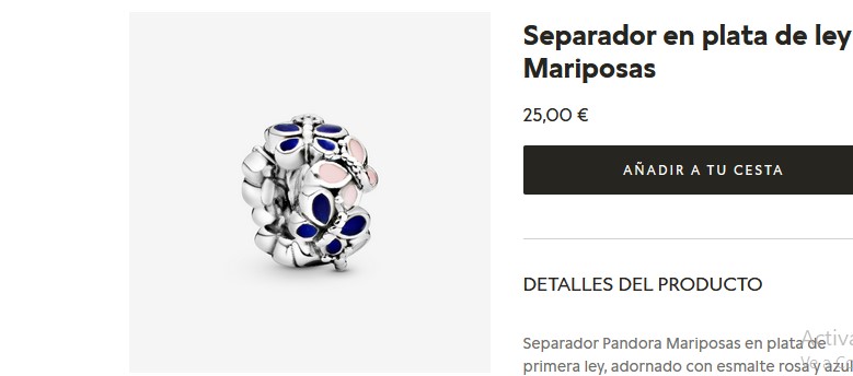 Los separadores de pandora mariposa, se caracterizan por estar fabricados en plata de primera ley. Inclusive, cuenta con unos diseños con esmalte rosa y azul; inclusive es completamente compatible con pulseras pandora moments. Cuenta un estilo y diseño únicos, como es el caso de metal plata esterlina, piedra sin piedras, color multicolor y temas naturaleza. Por lo que, no debes de perder tiempo y aprovechar la oferta por la página web por un precio de 25,00 €.