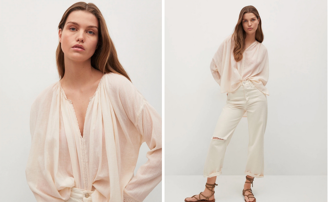 Esta blusa de textura de algodón cuesta 29,99€ en Mango. Disponible en varias tallas y en un único color: el blanco roto. Un color y un material ideal para esta época de calor, respetando tu piel y aportando mayor transpiración que otros tejidos.
