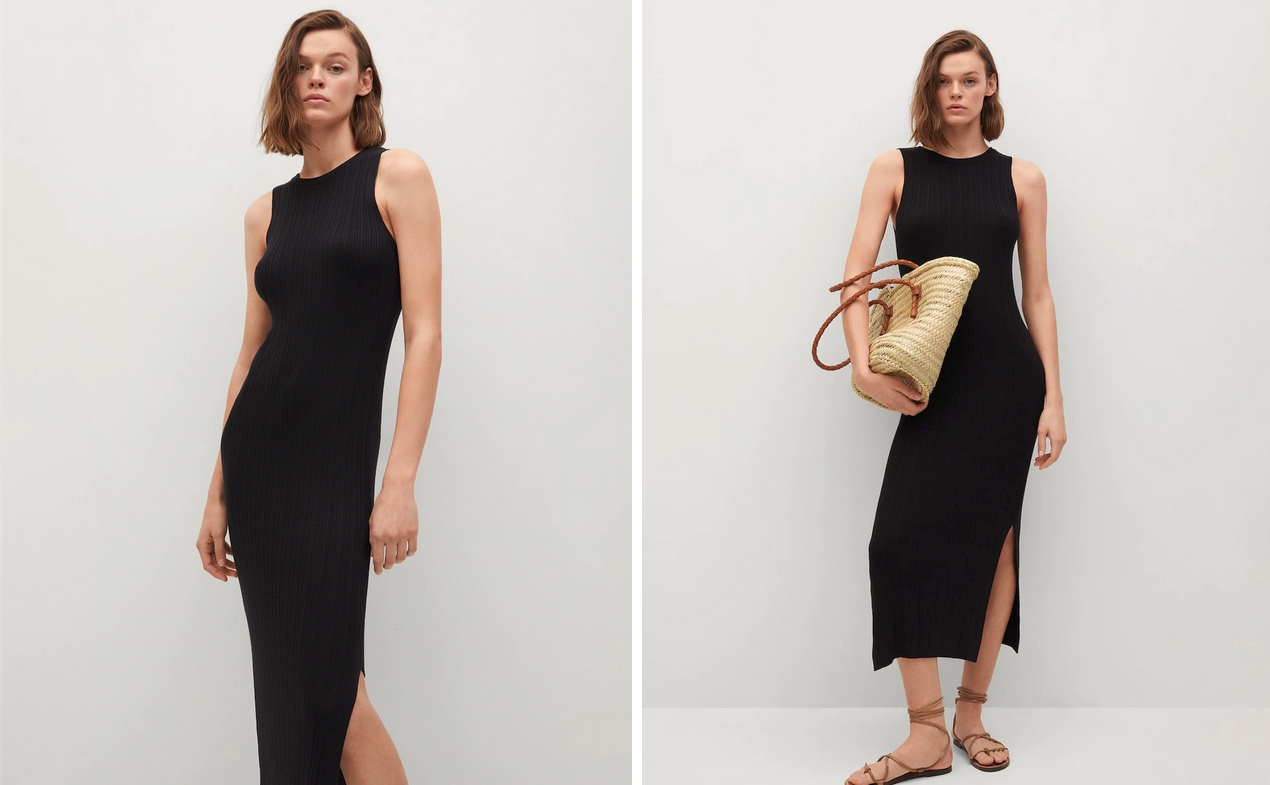 Por último, Mango también tiene este precioso vestido entallado con canalé. Una prenda que podrás encontrar en varias tallas y solo en color negro que le dan un aspecto mucho más elegante. Todo por 39,99€.