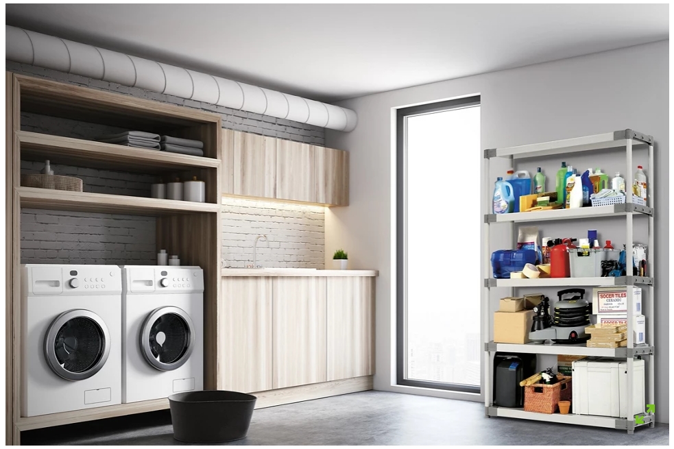 Esta estantería está fabricada en plástico de color gris y negro. Cuenta con 5 repisas que aguantan hasta 60 kg por cada balda.