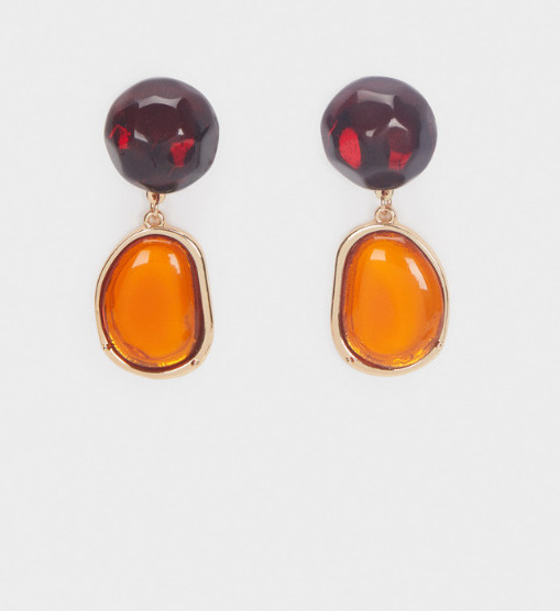 Muchas de las mujeres que se dan cuanta de que necesitan comprar un nuevo par de pendientes suelen acudir a una tienda de Parfois. Y con buen criterio. Porque saben que en ella encontrarán bonitos artículos a muy bajo precio. Como por ejemplo este juego de pendientes. Se trata de un artículo de tamaño grande que consta de dos partes. Una de ellas una pequeña piedra de cristal de color burdeos de la que sale un colgante de color naranja. Tiene un precio de tan solo 7 euros.