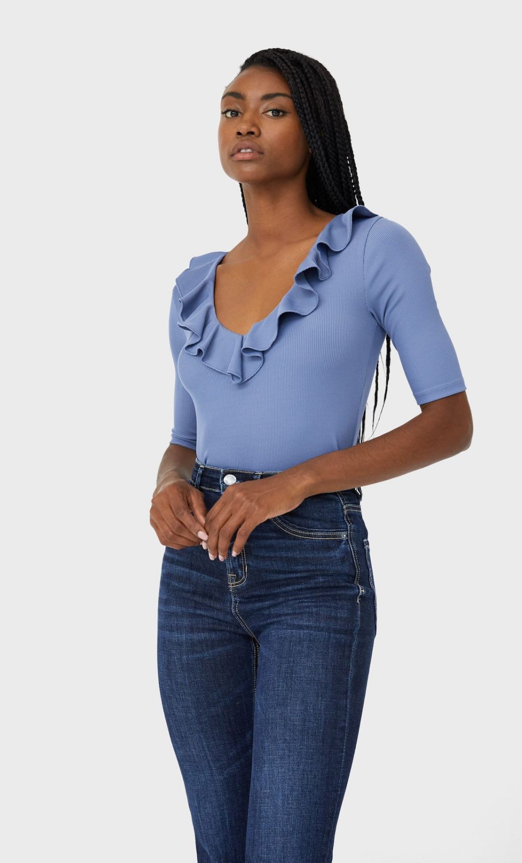 Ya que desde hace varios meses se han impuesto como tendencia, no podía faltar una camiseta con un diseño que contada con este detalle. Los volantes, al igual que las mangas abullonadas, están más que presentes en nuestras prendas de ahora.