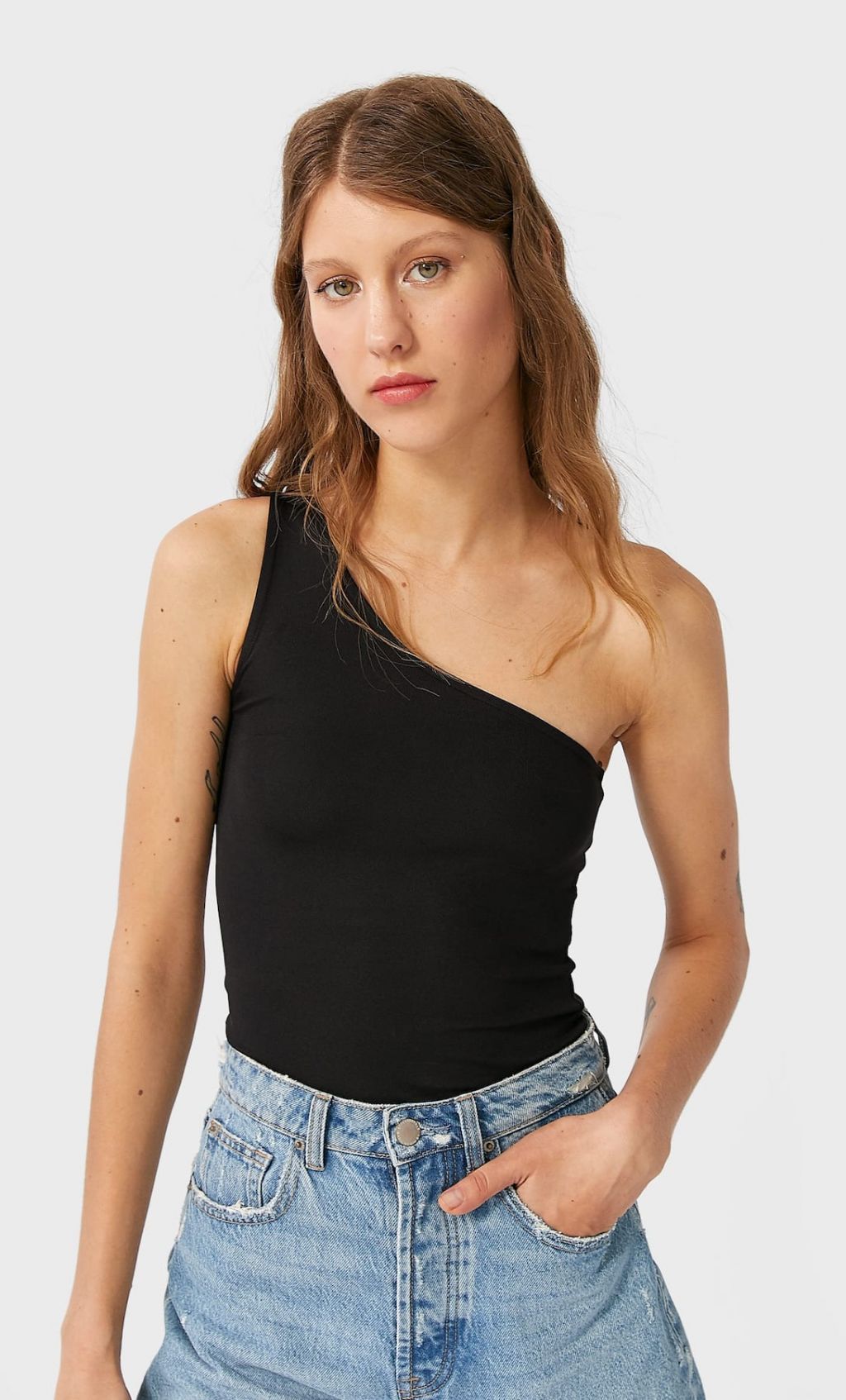 Este top asimétrico en color negro puede ser perfecto tanto para un día cualquiera en el que no debes hacer nada especial, o has quedado con amigo. Pero también para crear un outfit más elegante, sabiendo elegir el resto de prendas, calzado y complementos. El precio de este diseño de Stradivarius es de 9,99 euros y lo puedes encontrar en este enlace.