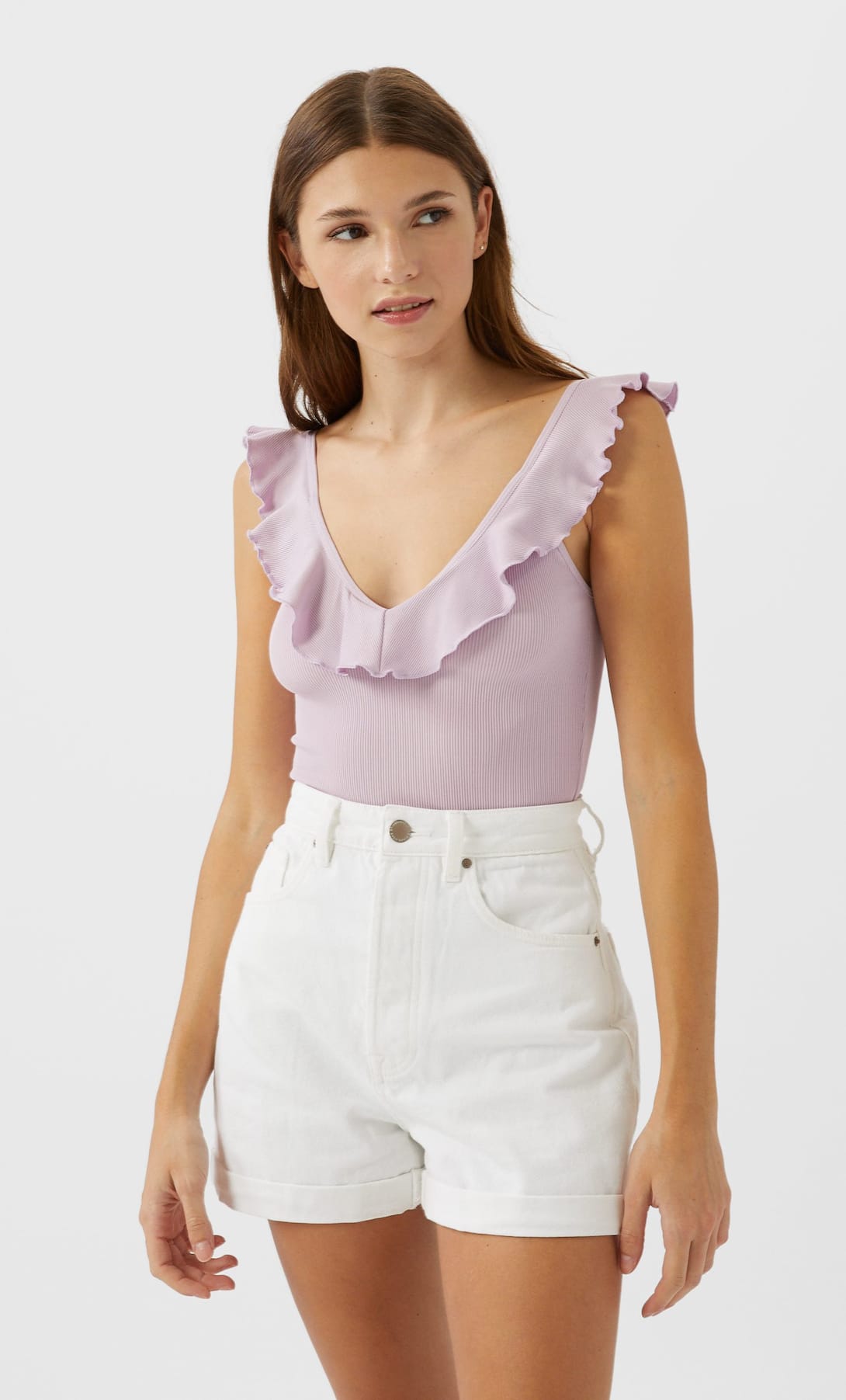 Otra de las prendas con volantes de Stradivarius que no te puedes perder, es este top de tirante ancho. Lo cierto es que para los días de calor, esta es mucho más cómoda de utilizar, ya que al no tener mangas, vas a estar mucho más fresquita.