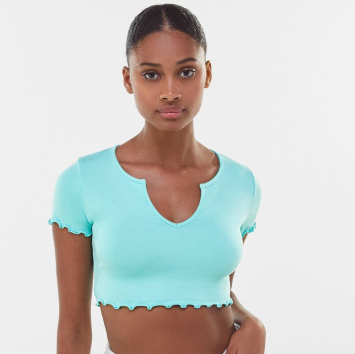 La combinación de camisetas de manga corta y escote suele ser problemática. Porque no son prendas que suelan admitirlo con facilidad. Hace falta saber mucho de diseño para acoplarlo y que quede bien. Pero en Bershka son expertos en conseguir con buen resultado diseños difíciles. Prueba de ello es la camiseta con escote que puedes ver en la imagen. Además tienen las mangas dentelladas. Está disponible en varios colores y está a precio de saldo. Solo cuesta 6 euros.