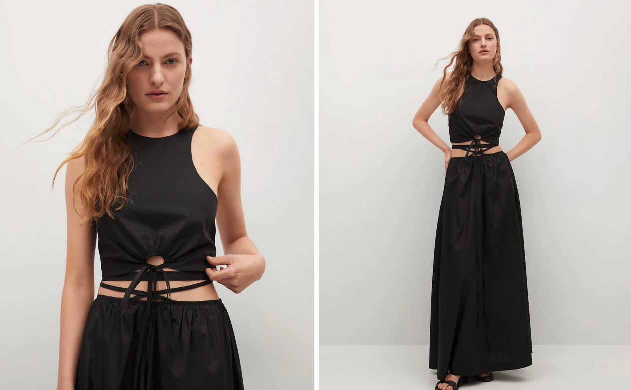 Este total look de Mango se encuentra también entre los más vendidos. Se compone de un top crop con lazo y una falda acampanada larga.