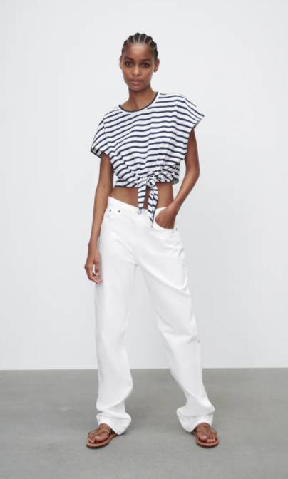 Las camisetas de estilo marinero son un clásico que nunca pasa de moda y que puedes lucir siempre que haga buen tiempo. Este modelo tiene cuello redondo, manga corta y se anuda en la parte frontal para que puedas lucirla con un diseño crop.