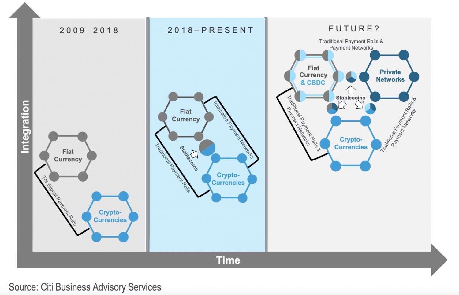Así, Citibank pronostica un posible escenario en el que criptomonedas, stablecoins, redes privadas (como por ejemplo una moneda digital adoptada por un núcleo de empresas) y CBDC convivan durante cierto tiempo, de forma que los ciudadanos puedan experimentar con los diversos sistemas sin necesidad de restringirse a uno solo, camino a la normalización de las nuevas opciones.