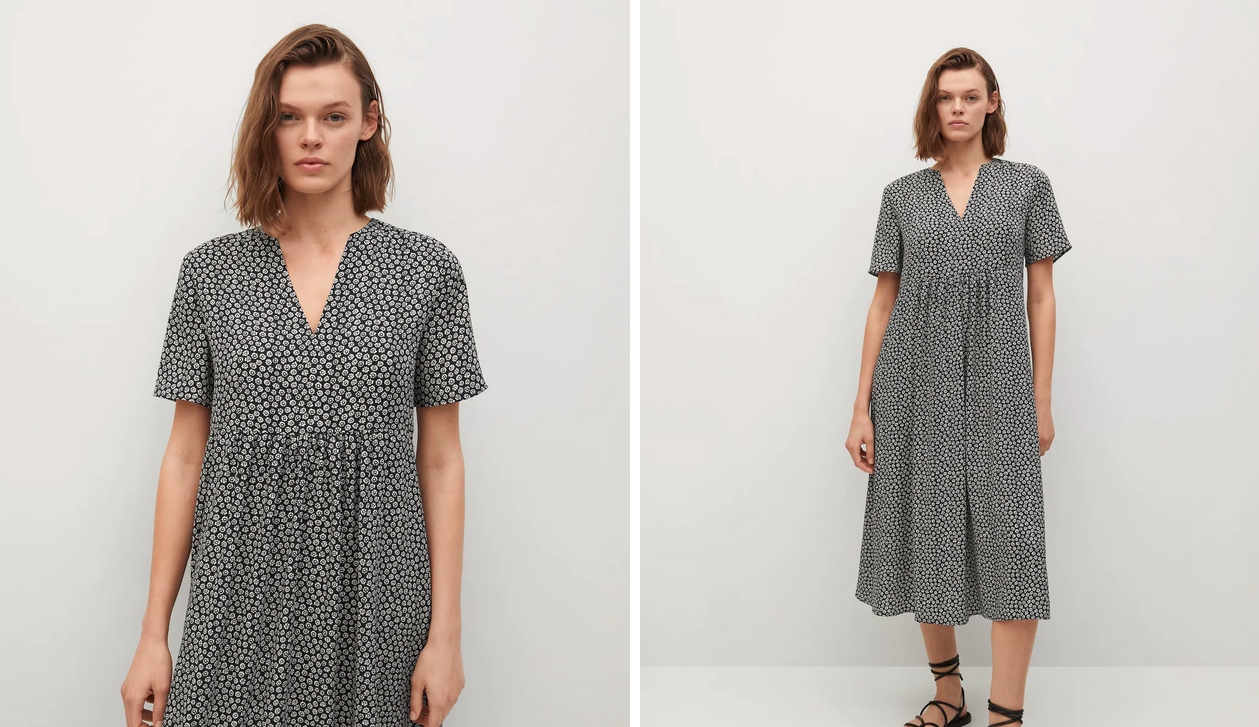 Por 29,99€ también puedes comprar este vestido fluido estampado de Mango. Solo disponible en su plataforma online de venta y en varias tallas.