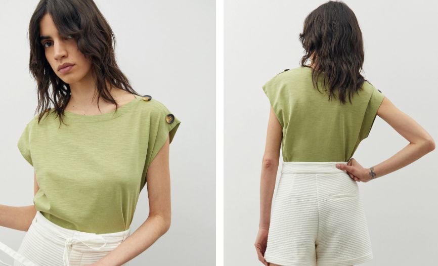 Otra propuesta de El Corte Inglés de lo más original y por eso merece estar entre las ocho mejore que consideramos para tu compra de camisetas de verano. En esta ocasión lleva un original toque en forma de dos botones en cada hombro a modo de adorno, ya que no es para abrir esa parte.