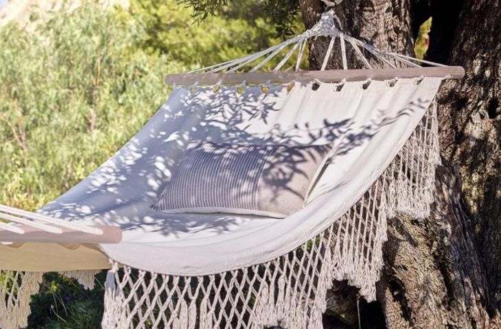 Se trata de una hamaca en color blanco con flecos decorativos a los lados. Para lograr una mayor consistencia dispone de dos varas de madera. La puedes colgar entre paredes o árboles, aunque si lo prefieres puedes hacerte también con una estructura de metal o madera que se vende aparte. El precio de esta hamaca es de 54,90 euros, y aquí es donde vas a poder encontrarla.