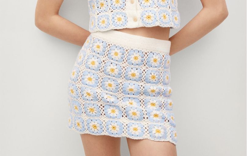 Una de las tendencias que hemos podido ver en celebrities e influencers desde que comenzó el calor, son los tejidos crochet. Se han puesto de moda extendiéndose a gran cantidad de prendas de vestir y accesorios. La combinación de las margaritas en colores pastel con este tejido crea una prenda versátil que sin duda repetirás mucho. Además en el caso de esta minifalda puedes llevarte el top a juego para tener el conjunto completo.
