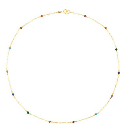 Que gusto da cuando uno se encuentra con un collar que sea tan elegante como divertido. Porque no abundan mucho, la verdad. Por eso nos ha llamado tanto la atención de este collar que nos hemos encontrado en el catálogo de Tous. Porque cumple con estas dos características. Tiene la elegancia propia con la que cuentan la mayor parte de las joyas que se pueden encontrar en estas tiendas. Pero las joyas de colores que lleva superpuestas le dan un toque muy alegre y divertido. Y lo mejor es que para comprarlo no hace falta que te gastes un pastón. Porque estos días, al tener un descuento del 20% se queda en tan solo 64 euros.