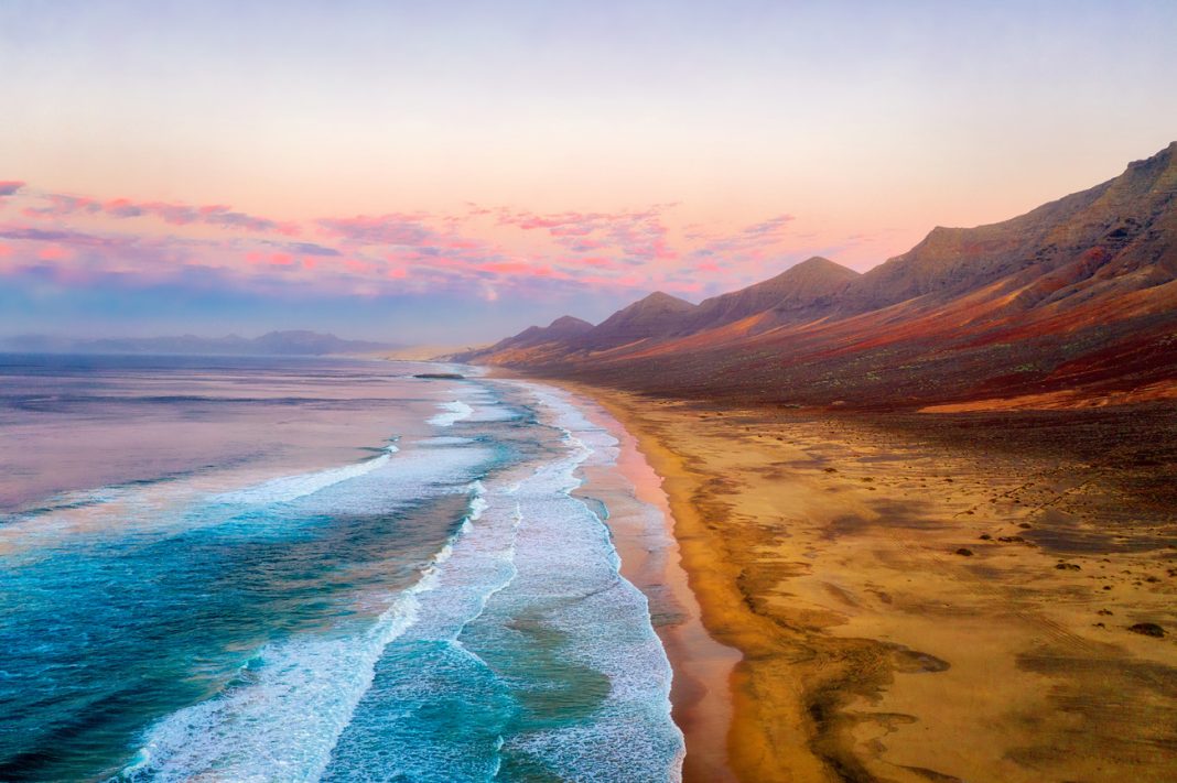 Una de las mejores playas salvajes de fuerteventura situada en la punta sur de la isla es Cofete. Pertenece a la península y parque natural de Jandía. Su acceso es largo y tedioso por un estrecho camino de piedras y doble sentido que atraviesa la montaña. Merece la pena ir a pasar el día y hacer una parada en el mirador del barranco Agua Oveja con espectaculares vistas para divisar la panorámica de la playa. Es recomendable consultar el viento que hará para poder disfrutar del paisaje con las mejores condiciones climáticas. Una vez que aparcas a pie de playa puedes alejarte kilómetros andando y conseguir estar completamente solo. La esporádica compañía que puedes tener si te alejas es la de las cabras que bajan de las montañas, pero en cualquier es caso es una playa muy ancha y no se acercan a la orilla. Un lugar virgen en el que vivir una experiencia inolvidable a lo largo de su extensión de casi 14 kilómetros.