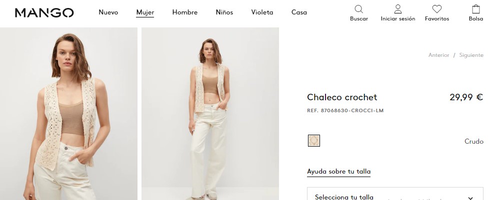 Es un hermoso chaleco crochet que es fabricado con el 60% de algodón y 40% de acrílico, es decir, está tejido con algodón. Además, con tejido de crochet y de punto calado, tiene un diseño recto con un cuello pico, sin mangas. Por lo que, es otra de las prendas preferidas de las mujeres en la temporada de verano. Cuenta con un cierre de botones en su parte delantera, dándole un toque y diseño único. Si no tienen este hermoso chaleco de crochet, anímate adquirirlo por Mango a un precio accesible de 29,99 €.