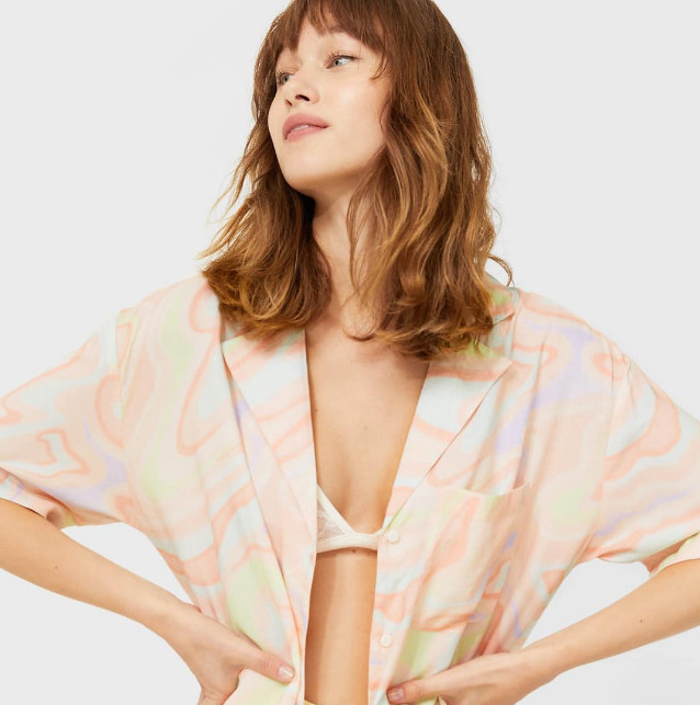 Los tonos pasteles, a diferencia de los oscuros, suelen venir muy bien para combatir las altas temperaturas. Por eso creemos que esta camisa que hemos visto en Stradivarius en ideal para romper durante esta estación. Porque justo tiene un estampado muy original a base de tonos pasteles en el que predomina el color vainilla. Además es muy barata, cuesta 15’99 euros.